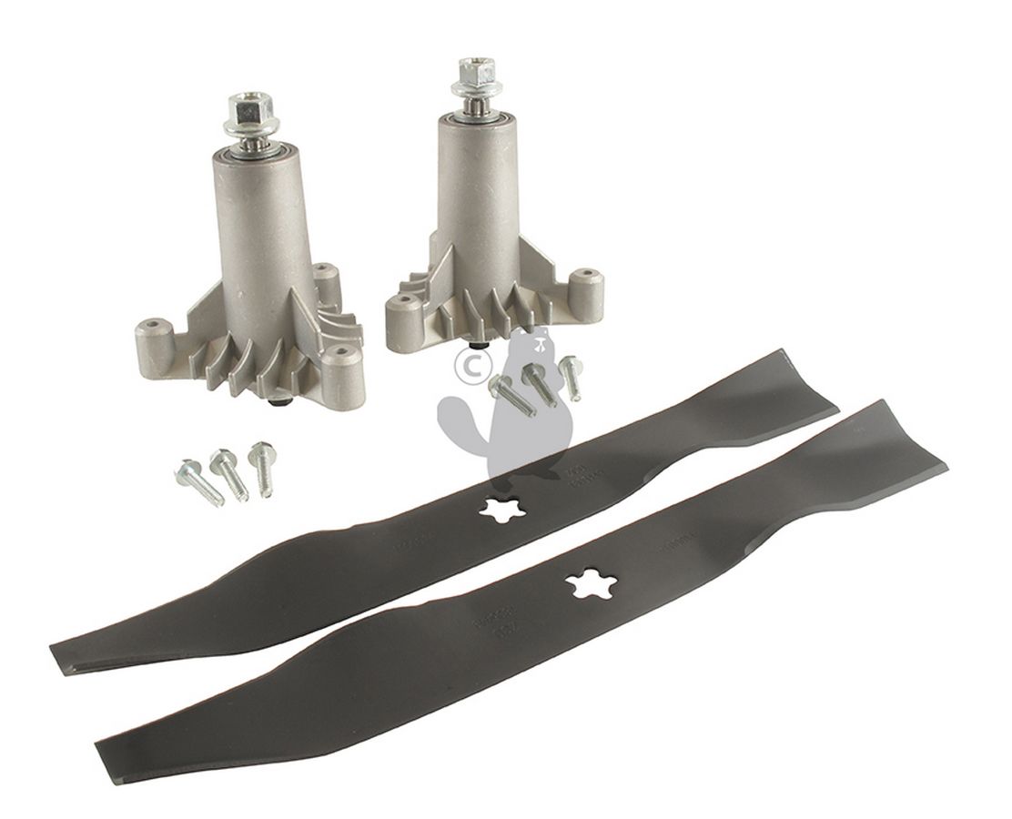 Kit réparation lames pour tondeuse autoportée AYP à éjection latérale 92cm (36"), composé de: 2 lames 1100014, 2 paliers 6500747, 6 vis de fixation des paliers 6408466.