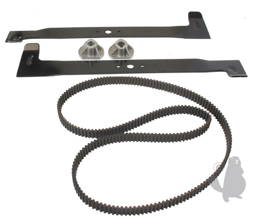 Kit réparation lames pour tondeuse autoportée CASTELGARDEN à éjection arrière 122cm, composé de: 1 lame gauche 1100044, 1 lame droite 1100045, 1 Courroie DS8M180025, 2 moyeux 6100358.