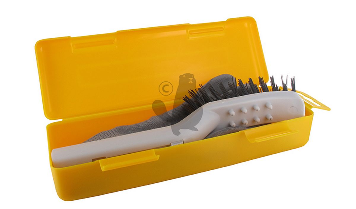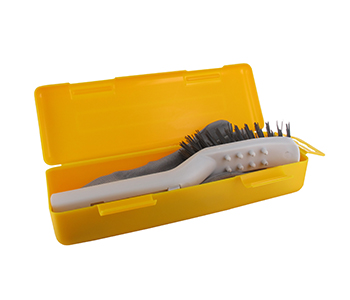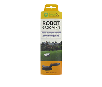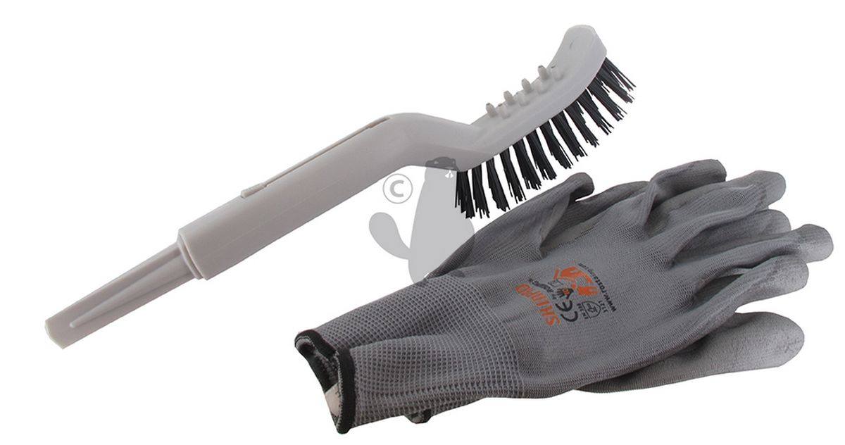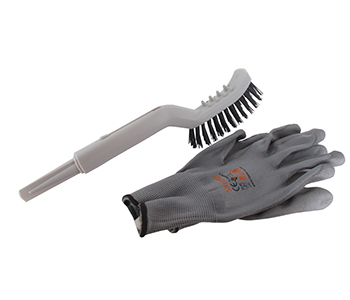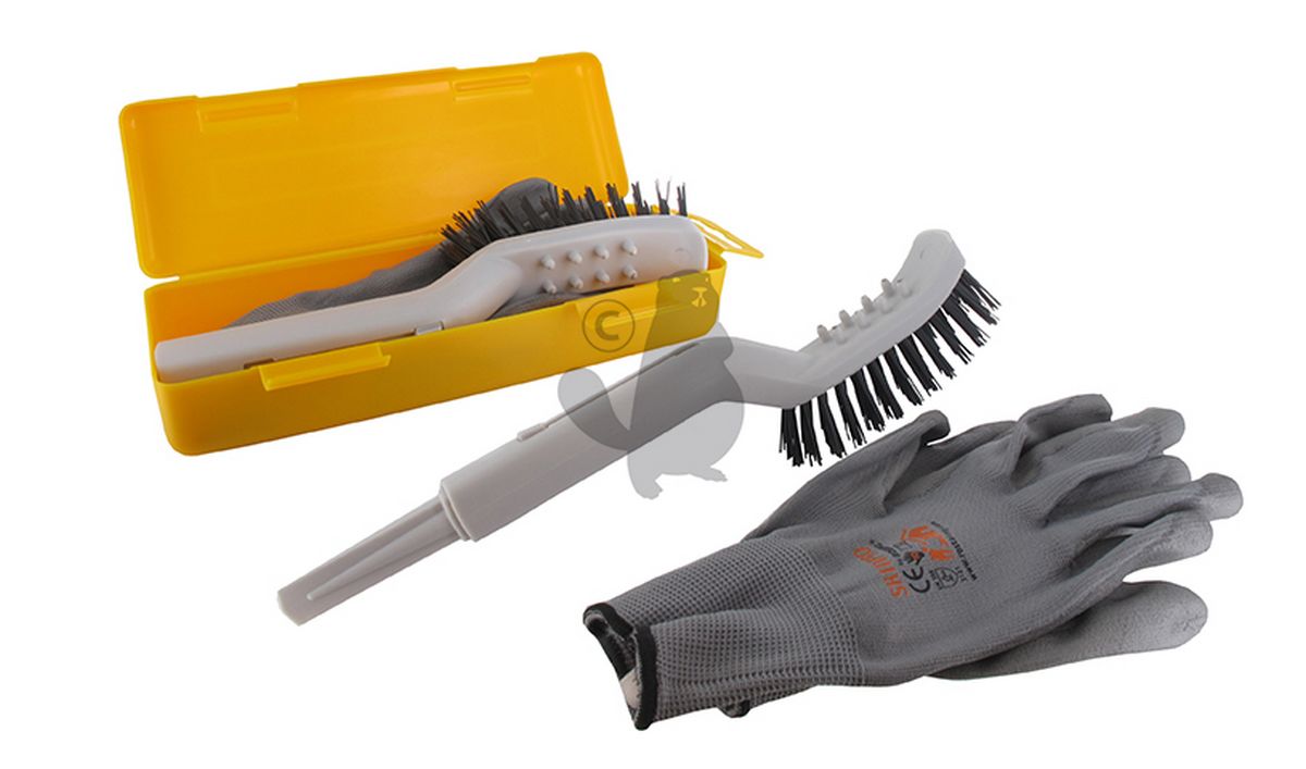Outil de nettoyage pour robot de tonte avec raclette, brosse dure et brosse souple et picots de nettoyage des roues. Livré en malette et incluant une paire de gants.