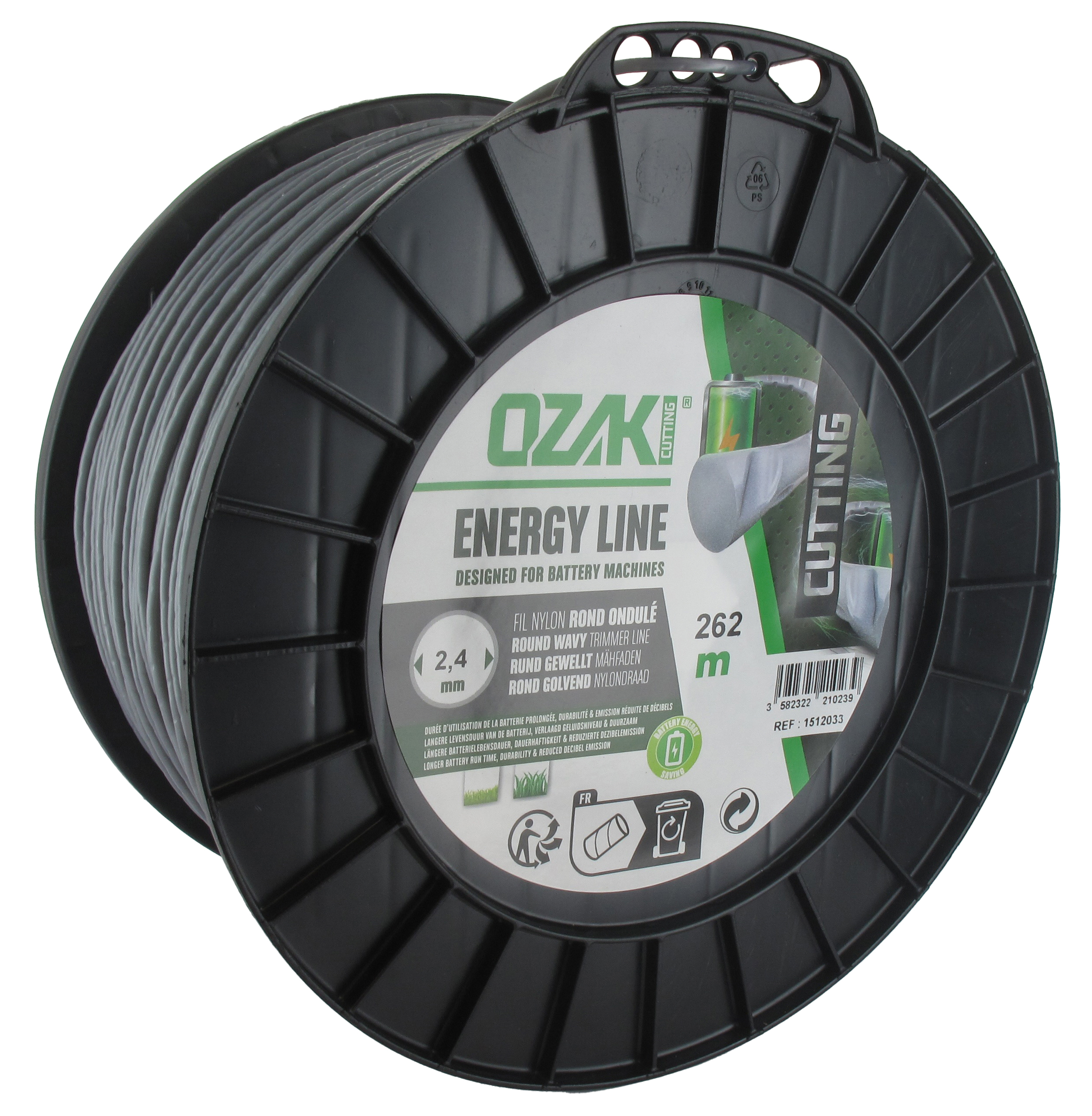 Bobine fil nylon ondulé rond OZAKI ENERGY LINE. Breveté, pour optimisation autonomie des équipements à batterie - Longueur: 262 m, Ø: 2,40mm.