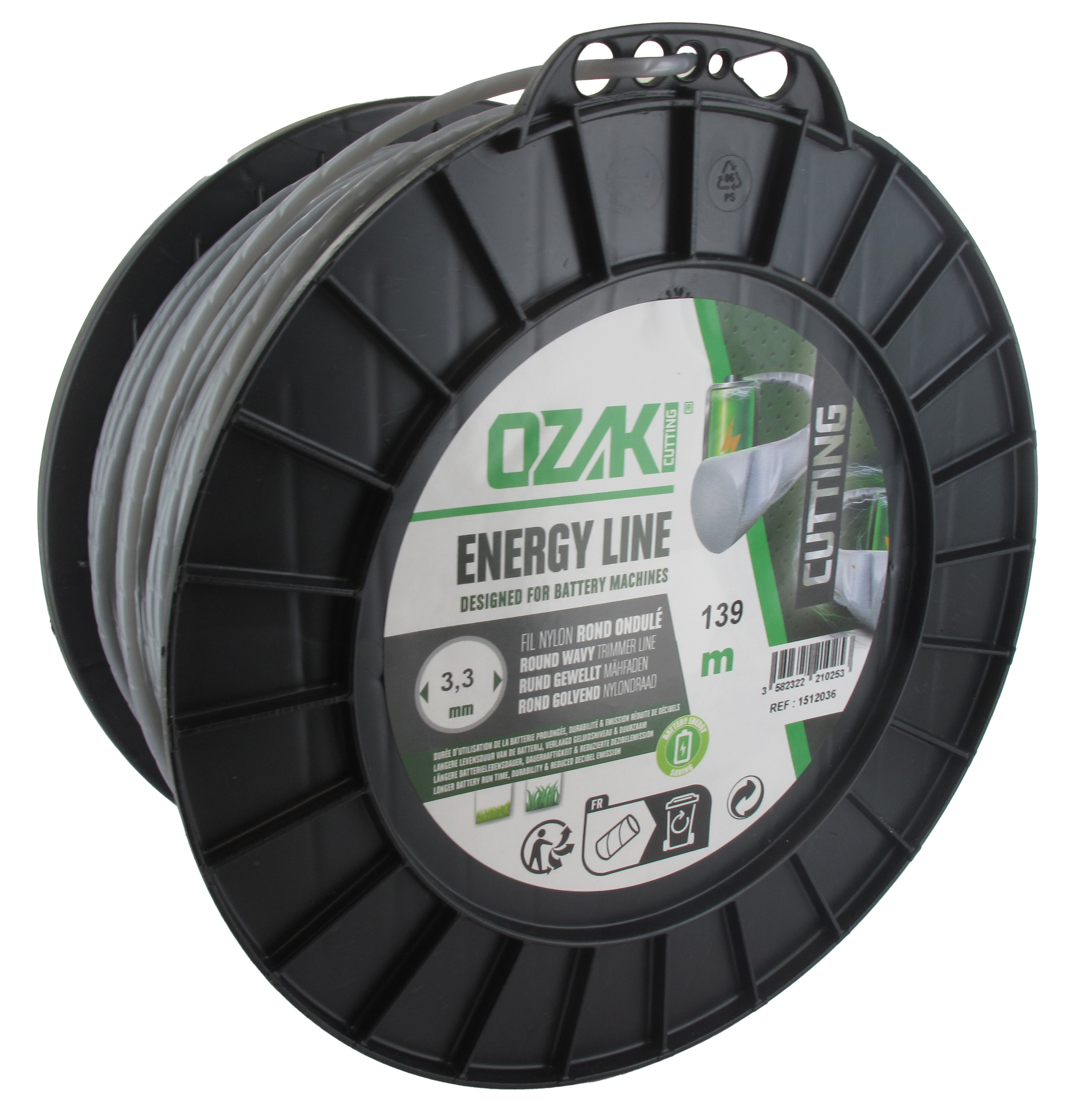 Bobine fil nylon ondulé rond OZAKI ENERGY LINE. Breveté, pour optimisation autonomie des équipements à batterie - Longueur: 139 m, Ø: 3,30mm.