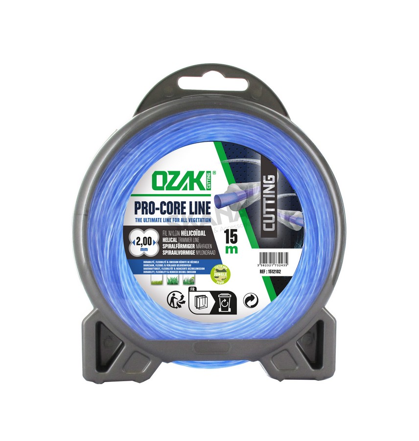 Coque fil nylon OZAKI PRO-CORE LINE. Co-extrudé âme absorbante (flexibilité) et enveloppe haute resistance (longévité) à forme helicoidale (réduction du bruit) - Longueur: 15 m, Ø: 2,00mm.