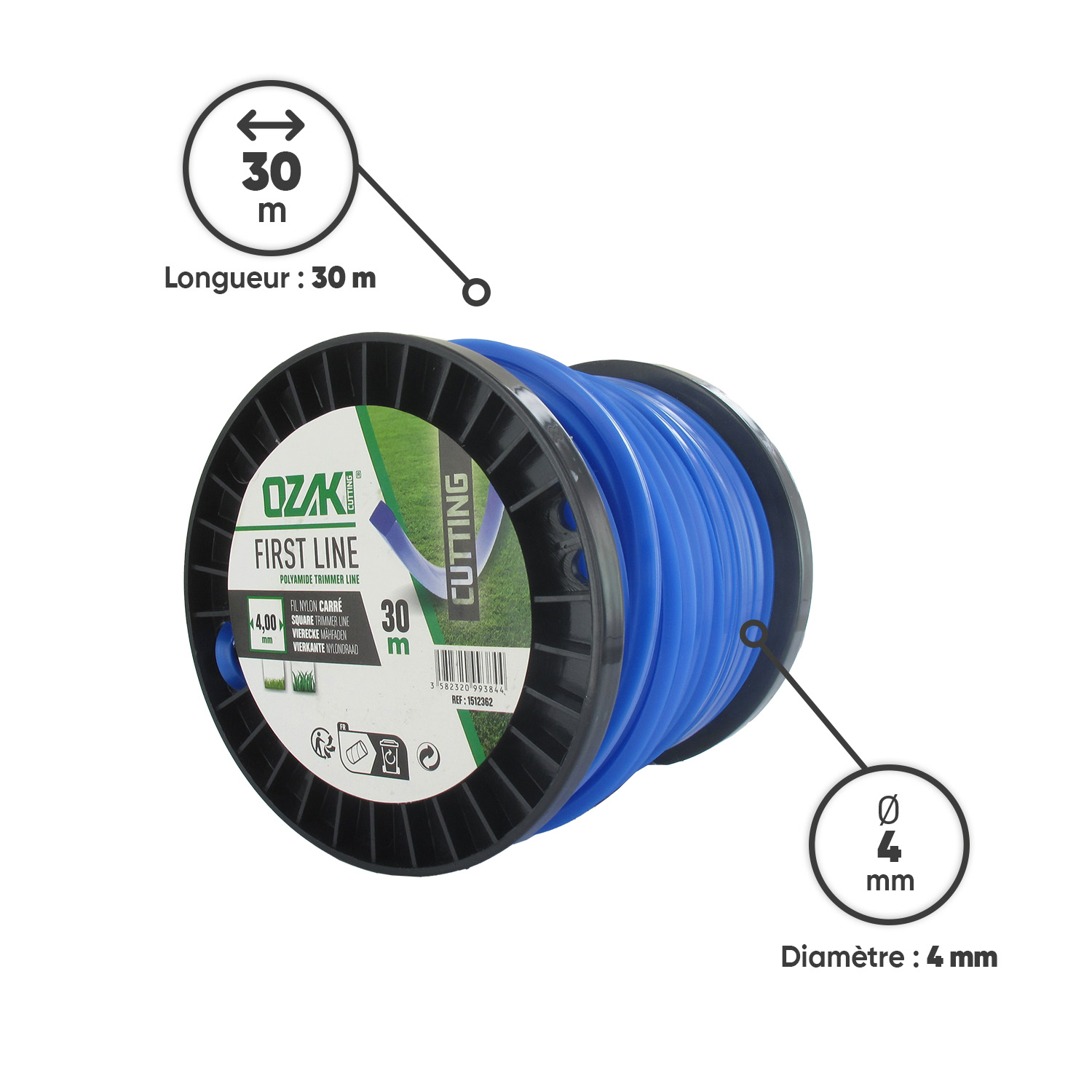 Bobine fil nylon carré OZAKI - Longueur: 30m, Ø: 4,00mm