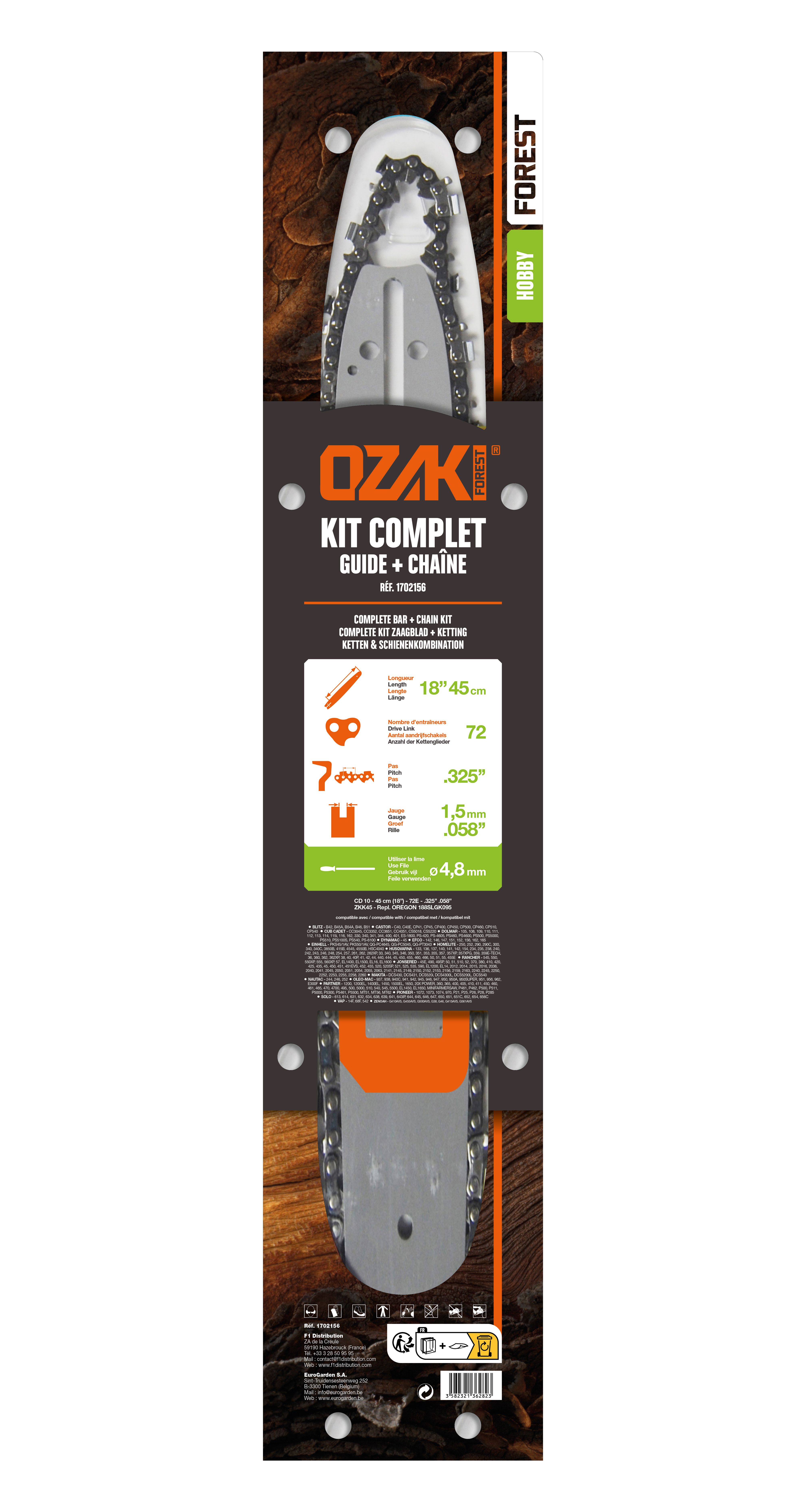 Guide de 45 cm montage K + chaine .325" .058 (1.5mm) - 72 entraîneurs ( E72 ) OZAKI. Remplace origine Oregon 188SLGK095 - Livré sous coque.