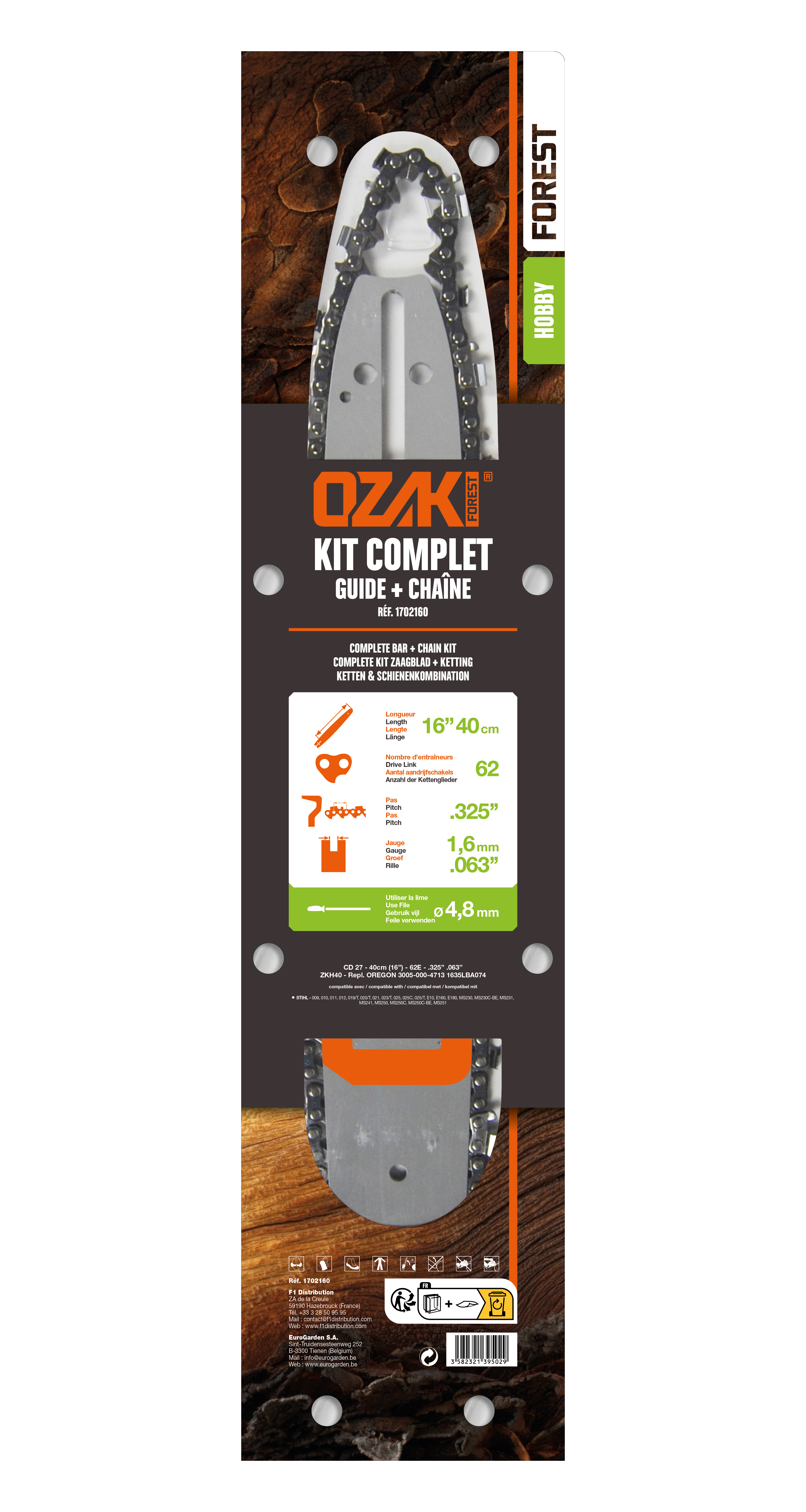 Guide OZAKI 40 cm montage H + Chaîne .325" .063 (1.6mm) 62 entraîneurs ( E62 ). Remplace Guide Oregon 1635LBA074. Livré sous coque.