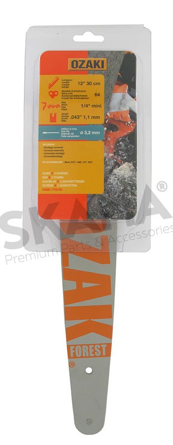 Guide OZAKI modèle ZKU30MINI + deux chaînes 1/4" .043 (1.1mm) 64 entraîneurs. Montage universel pour élagueurs guide 12" (30cm). Livré sous coque.